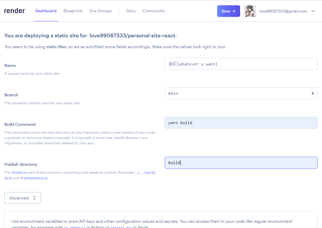 用Render部署React、Vue這類Static的專案,好處相較於Laravel是不會有睡眠時間(免費的話),